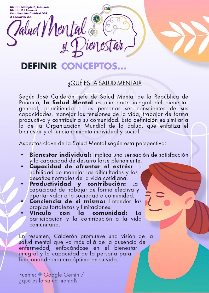 Según José Calderón, jefe de Salud Mental de la República de Panamá, la Salud Mental es una parte integral del bienestar general, permitiendo a las personas ser conscientes de sus capacidades, manejar las tensiones de la vida, trabajar de forma productiva y contribuir a su comunidad. Esta definición es similar a la de la Organización Mundial de la Salud, que enfatiza el bienestar y el funcionamiento individual y social.